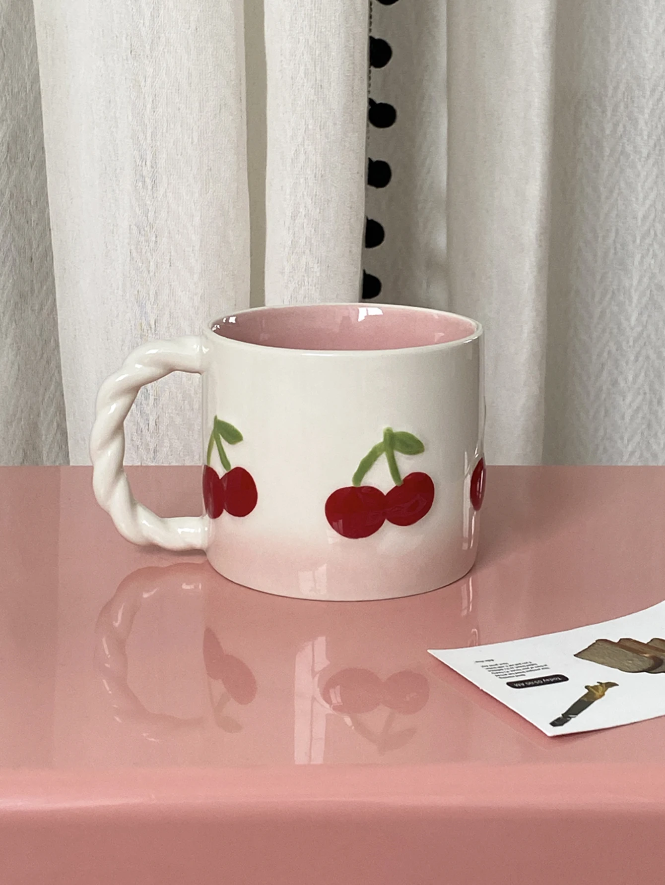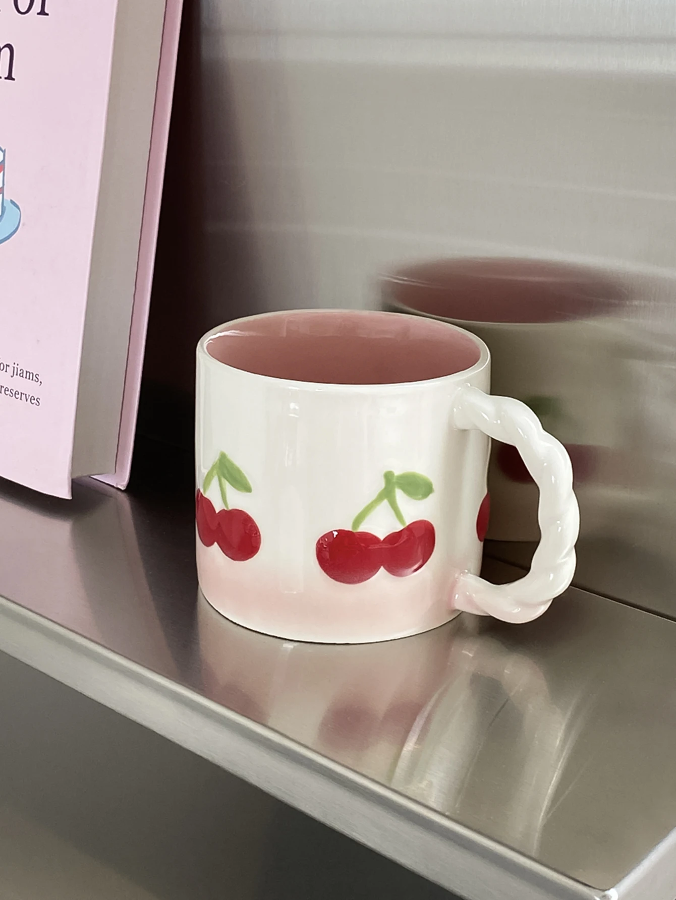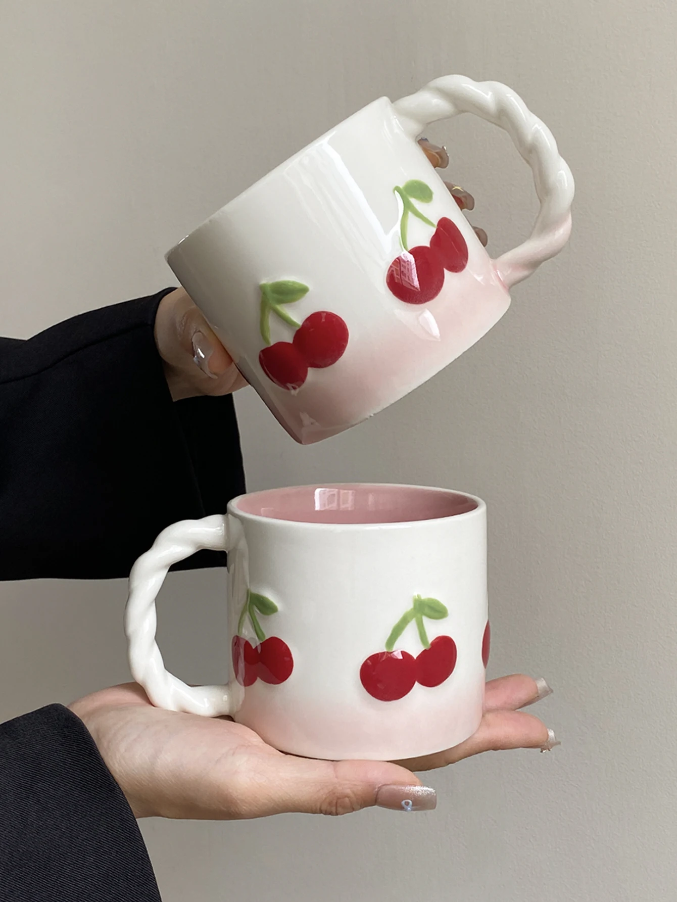 Pink Cherry Ceramic Mug, Twist Handle Ceramic Exquisite Pink Gradient Cup