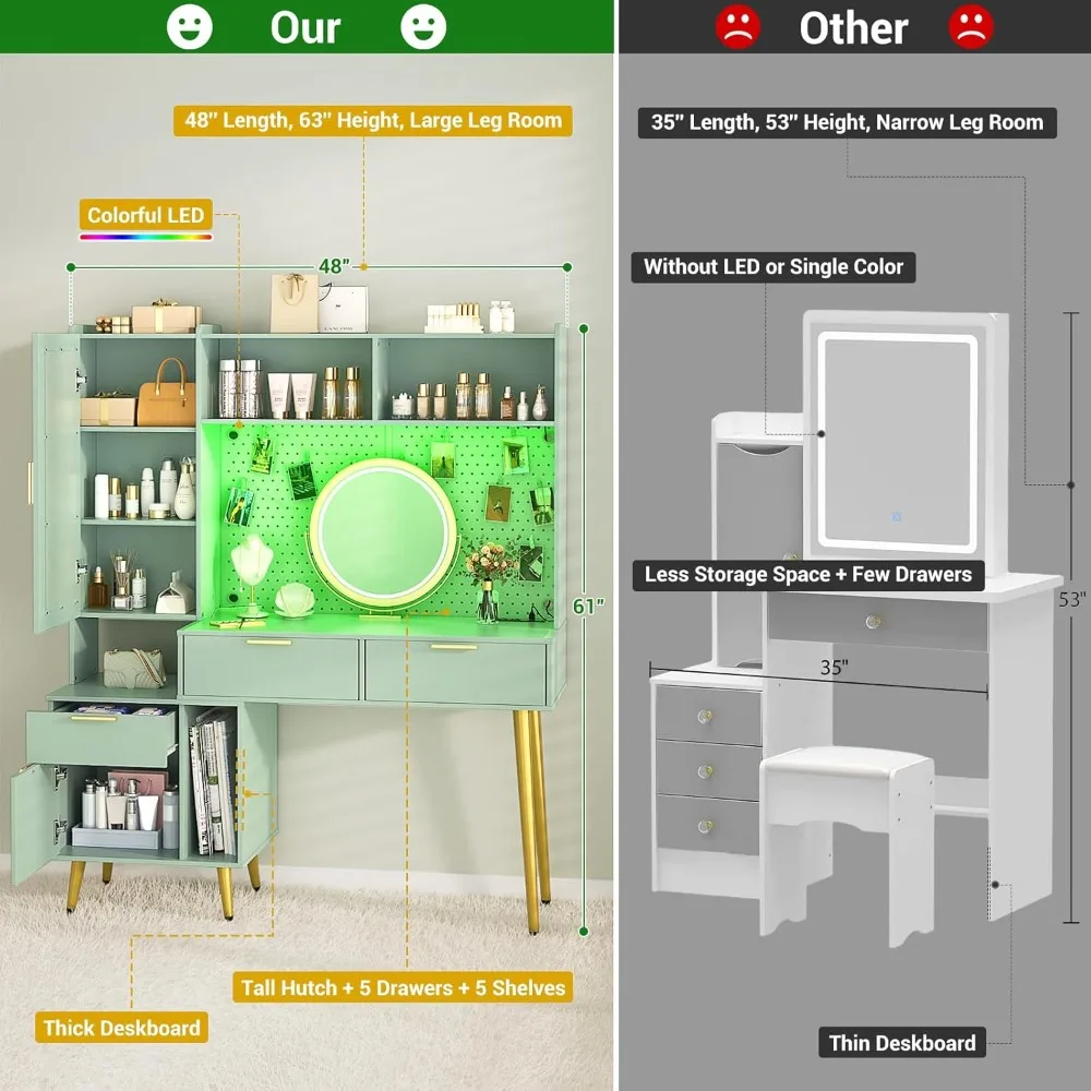 - Tall and Large Dressing Tables with Hutch - The height of this vanity desk is 61 inches. so it has a lot of space for storage and the length is 48 inches. the dressing table's length is 35''. so you can have a large leg room. this large dressing table has a DIY pegboard. you can hang up your hair dryer and curling iron too.
