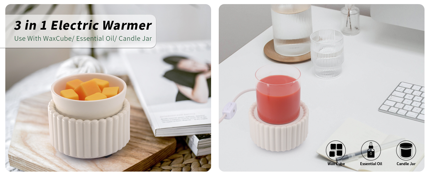 - 【DESIGN OF 3 IN 1ã€? This wax melt warmer offers a versatile 3-in-1 design. allowing you to enjoy the delightful scents of essential oils. jar candles. and wax cubes. Immerse your space in a sweet and inviting aroma. With a 59-inch power supply line equipped with an easy on-off roller switch. a removable dish for wax melts. and a warming plate for candles. this wax burner ensures convenient and hassle-free usage.