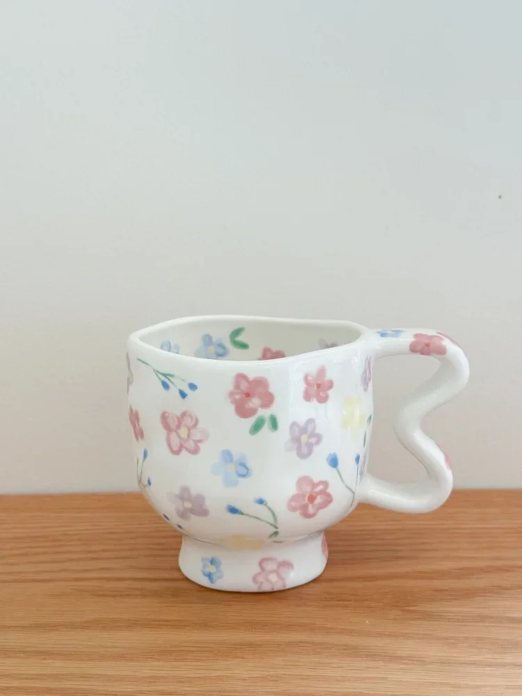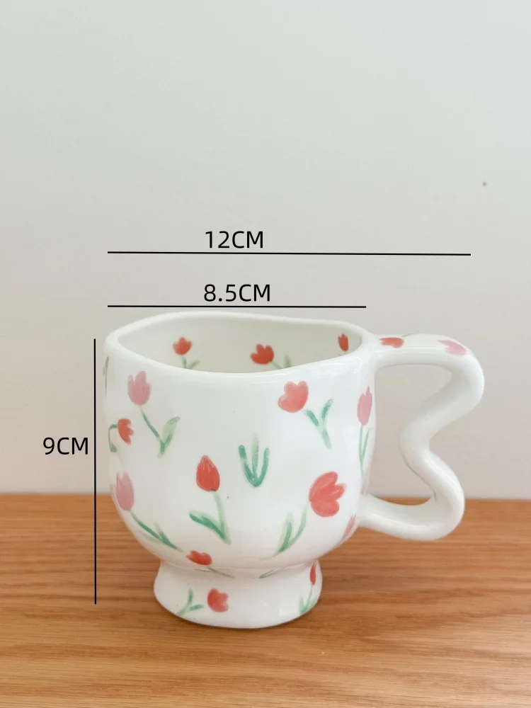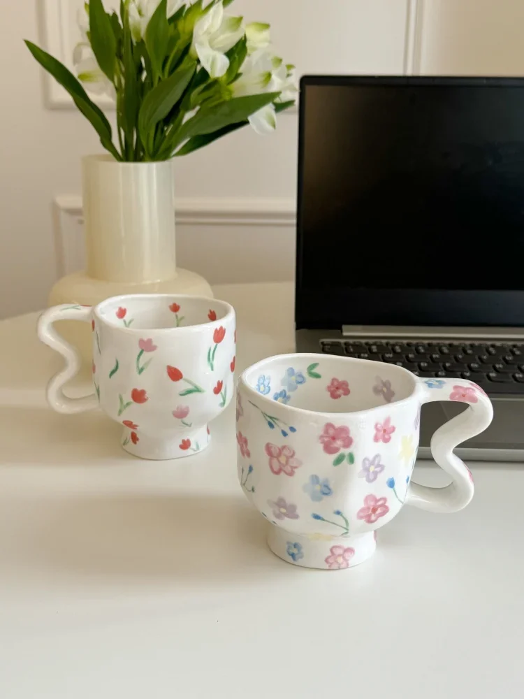Ceramics Mug Cute Flower Pattern High Footed Coffee Cup Oat Juice Breakfast Milk Cup Leisure Time Water Cup Birthday Gifts Mug