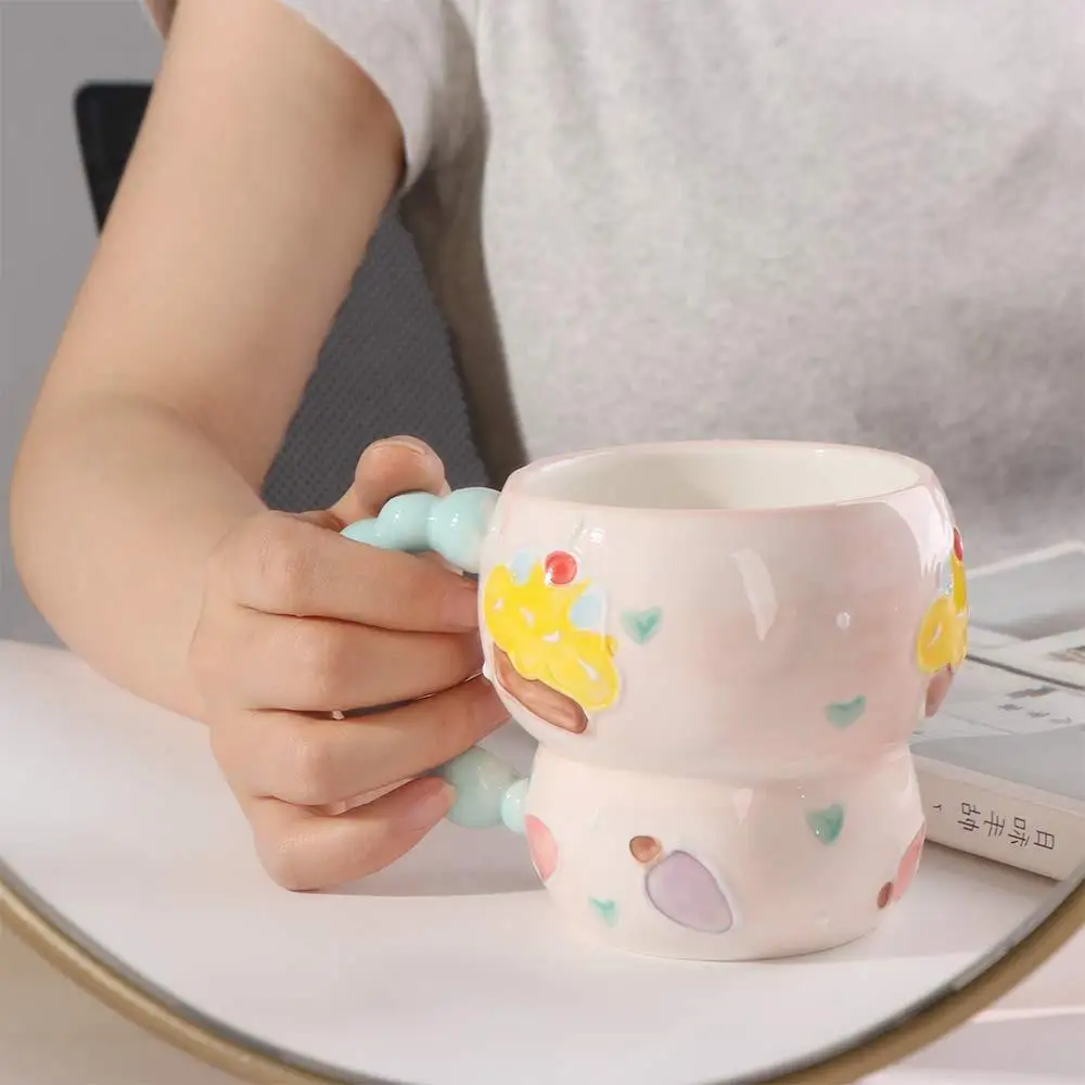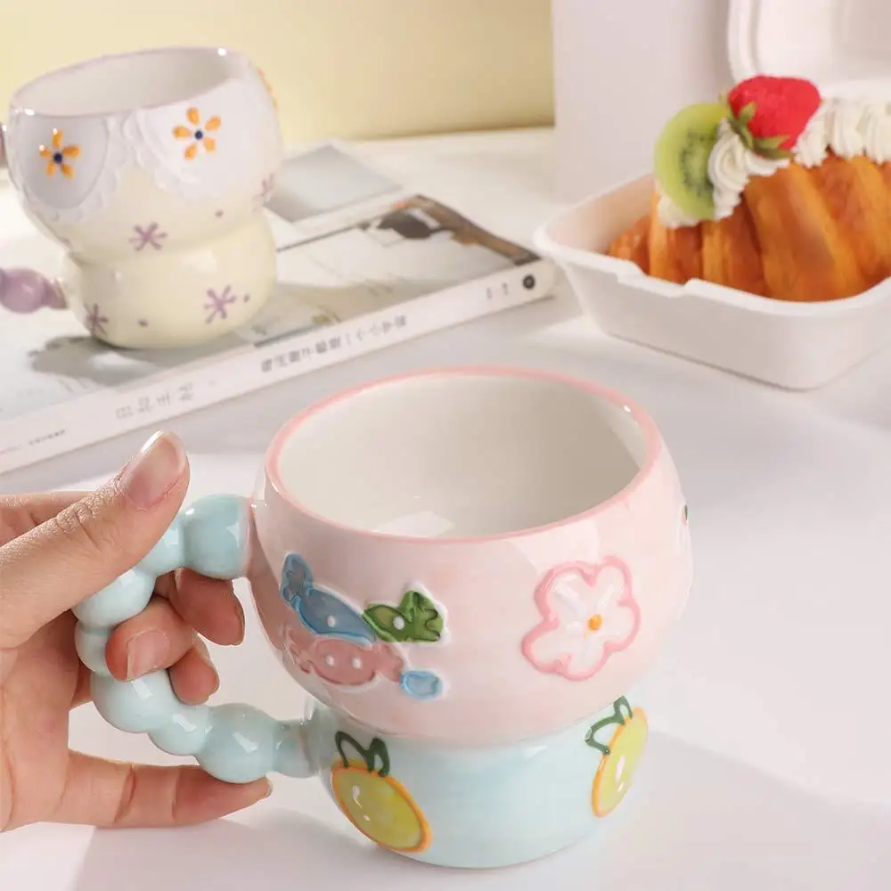 Fruit Pattern Gourd Shape Mug: This hand painted embossed ceramic breakfast cup features a fresh and gentle aesthetic. designed to rouse daily life inspiration. The adorable creative design makes it a great addition to any home kitchenware collection.