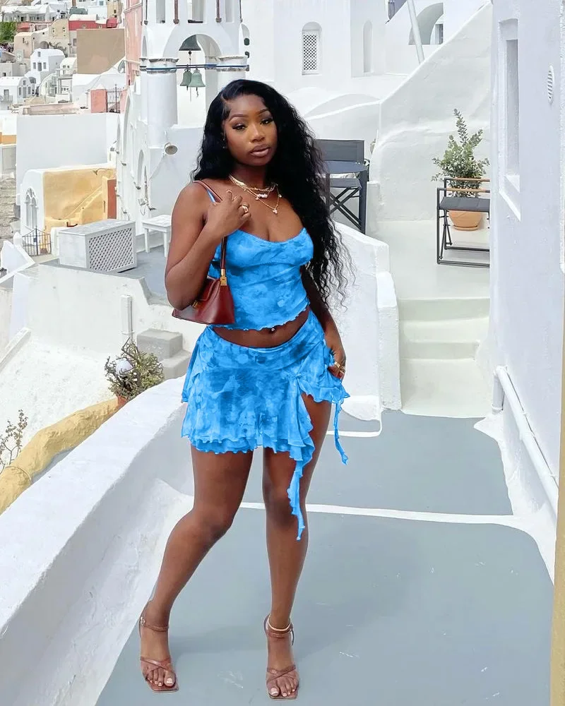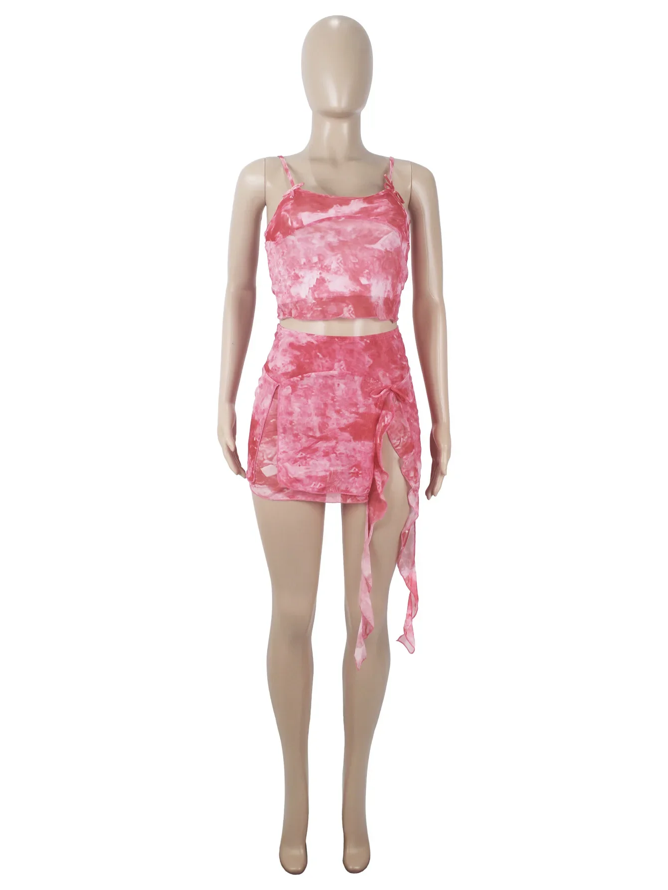 Women's Fashionable Mesh Printing Sexy Side Slit Mini Two Piece