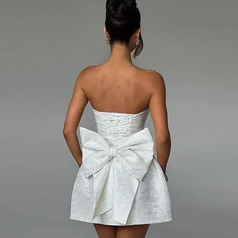 Elegant Jacquard Strapless Bow Women Chic Fashion Sexy Sleeveless A Line Mini Evening Party Dress