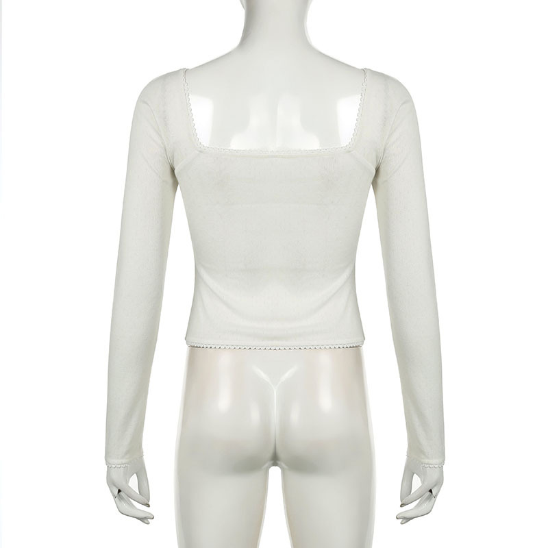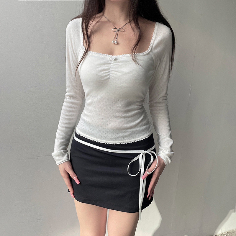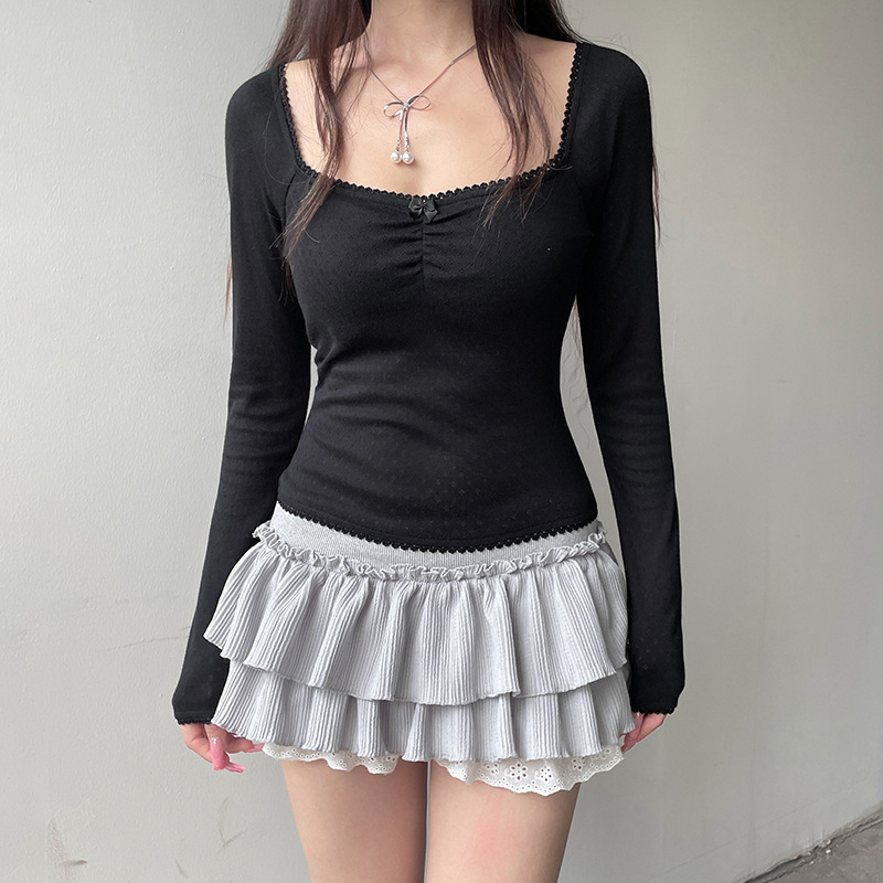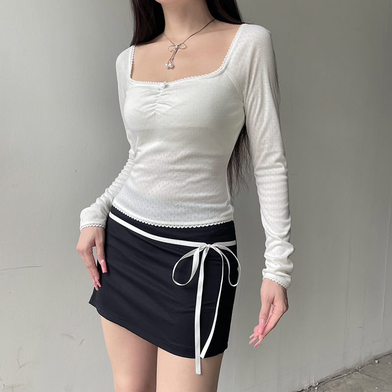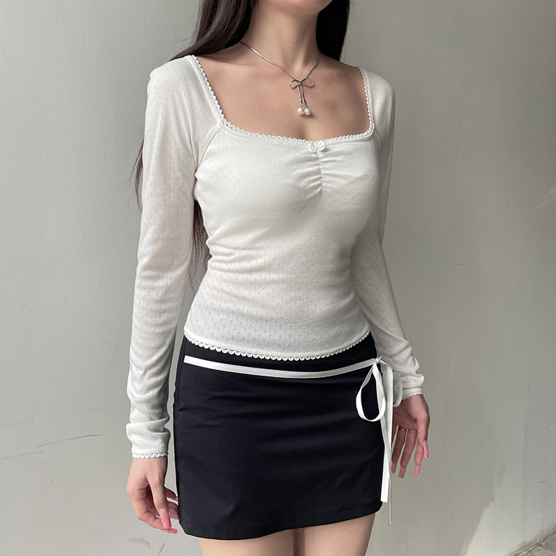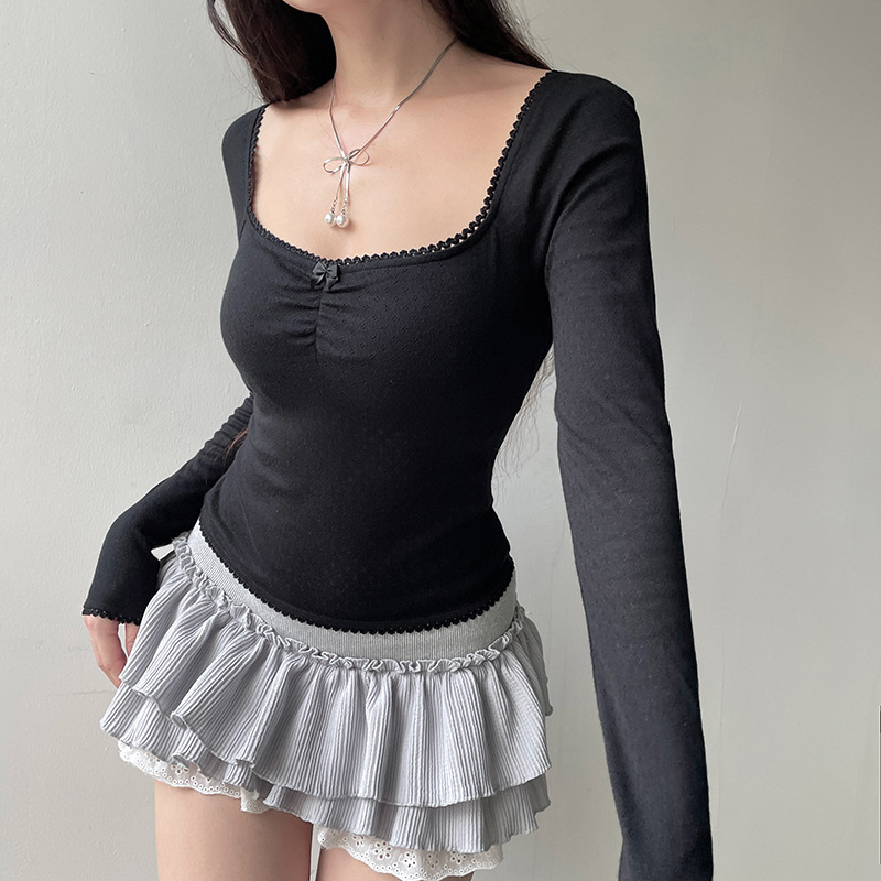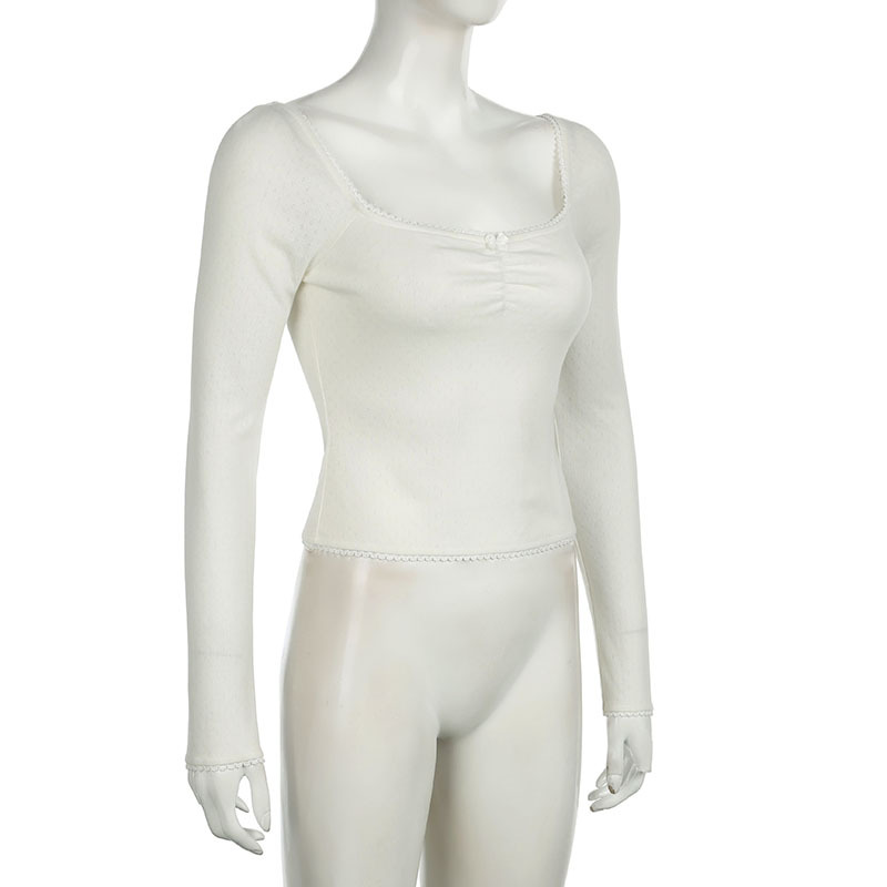 Square Collar Lace Bow Long Sleeve Top For Women