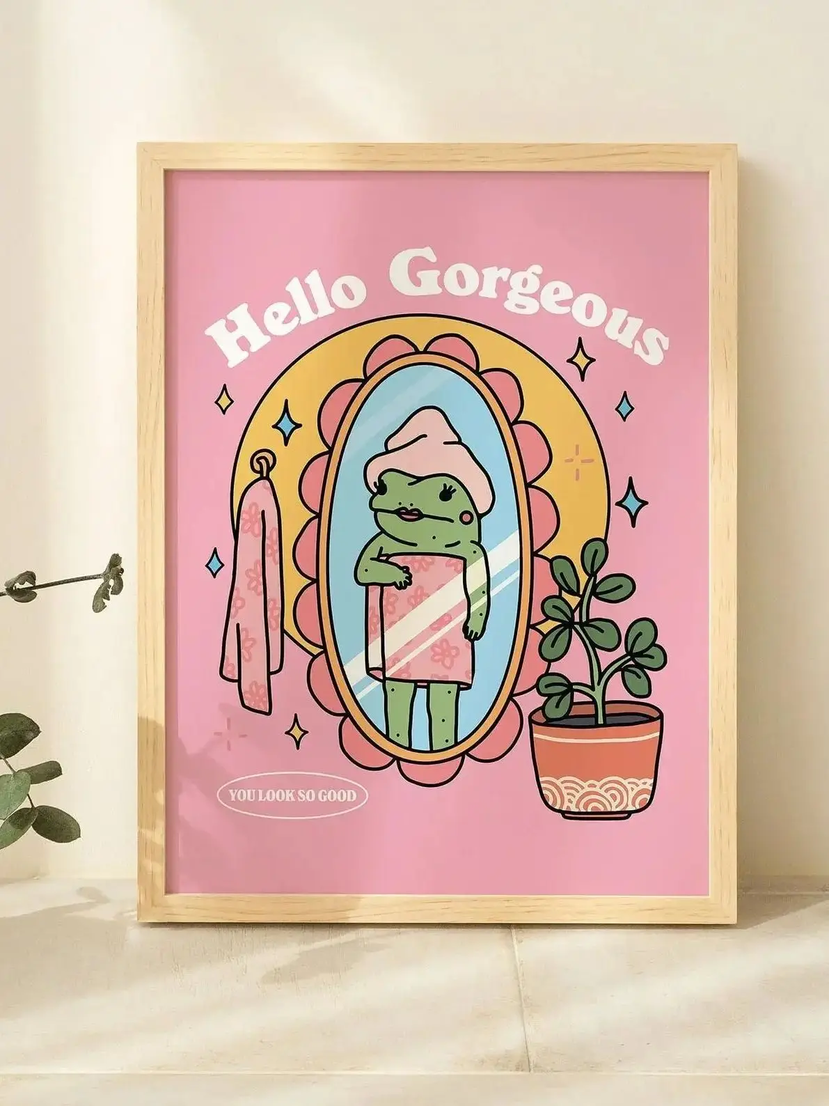 Girly Frog Self Love Wall Print, Positivity Hello Gorgeous Quote, Pink Retro Posters