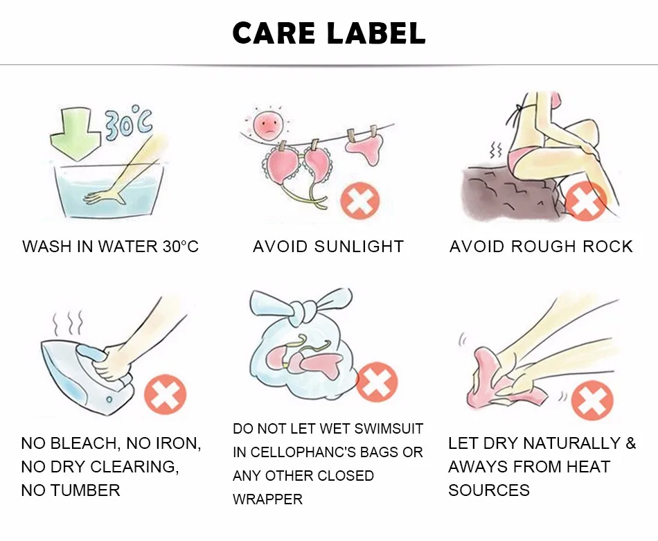 5.Never use bleach.washing detergents.soap or shampoo when washing your swimwear.Simply rinse thoroughly with fresh water after each use.