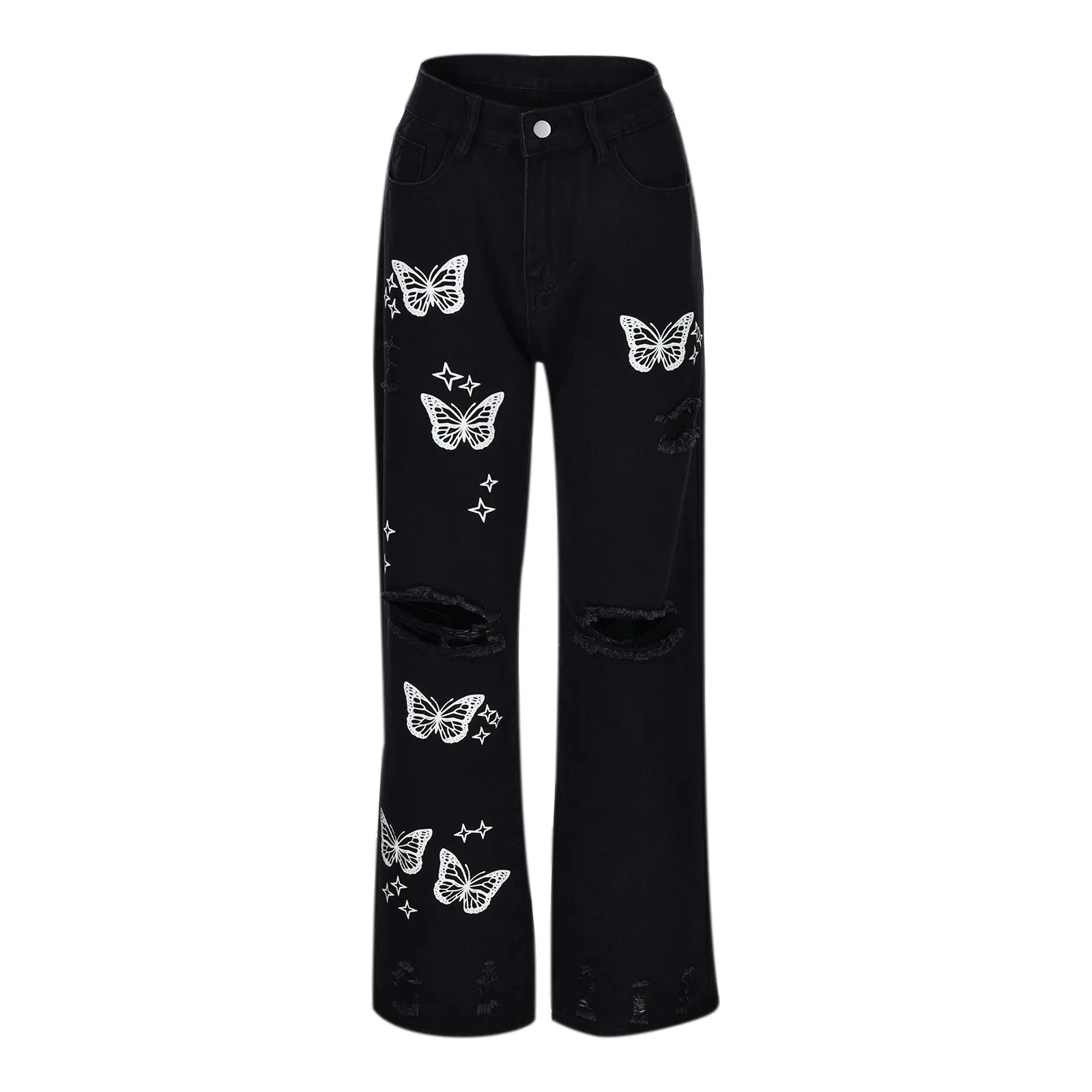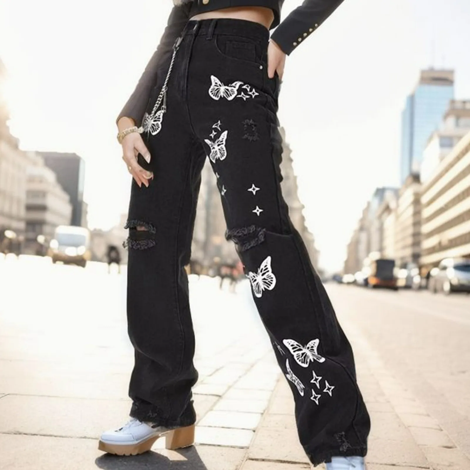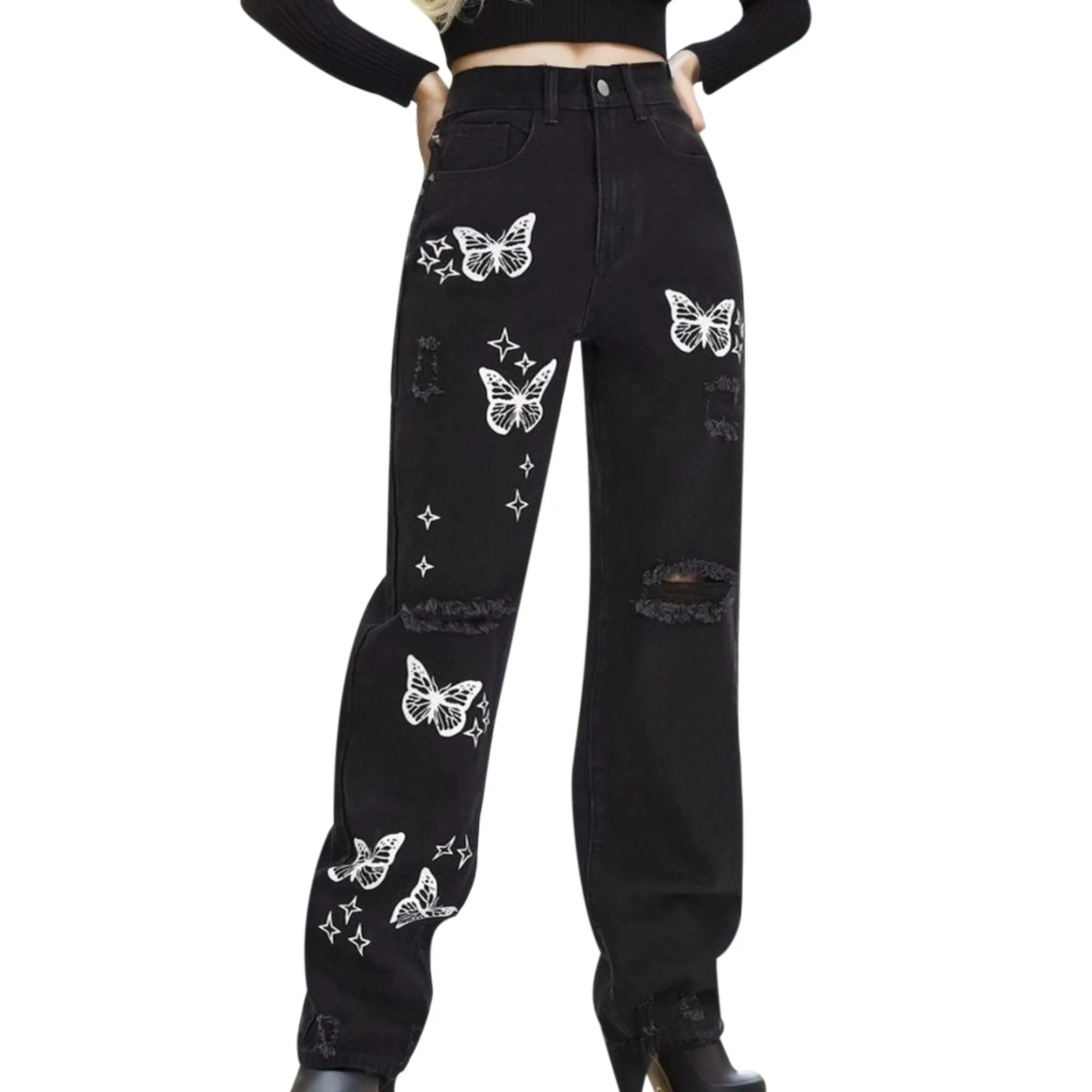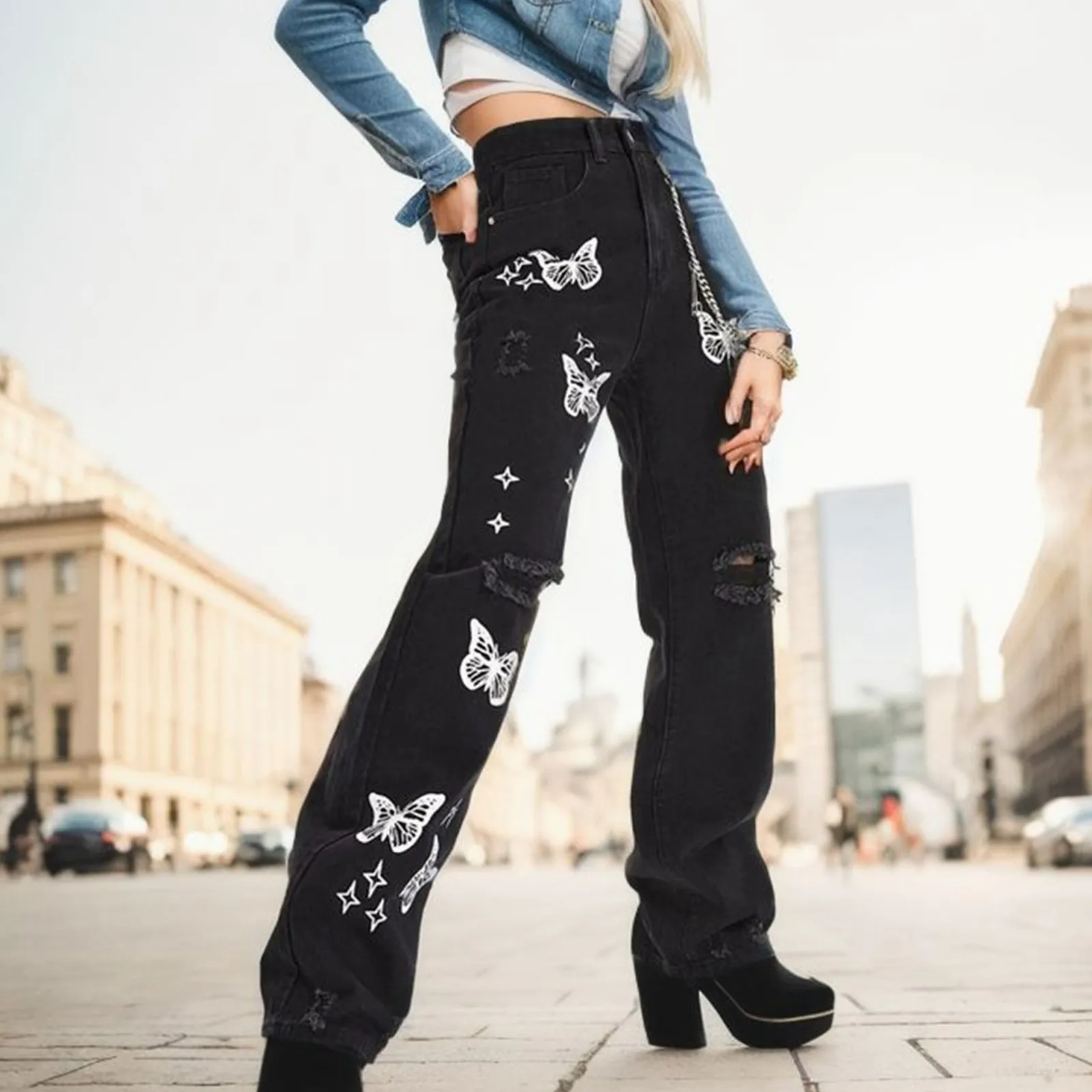 Women's Fashionable Distressed Butterfly Print High Waist Straight Leg Jeans New Street Style
