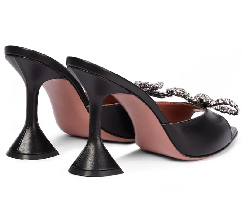 Ladies Black PU Leather Crystal Bowknot Women Slippers Sandals Fashion Goblet Heeled High heels Mules Slides Shoes
