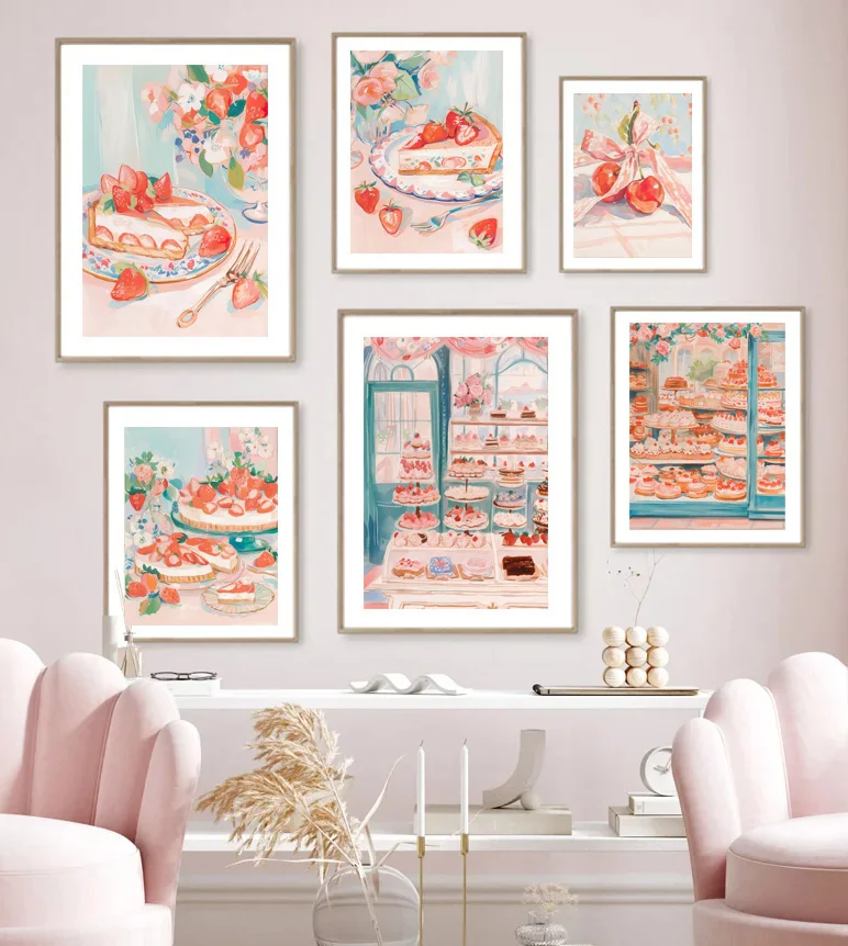Retro Pink Cake Shop Dessert Gourmet Strawberry Cake Tea Poster Canvas Painting Prints Art Pictures Wall Decor