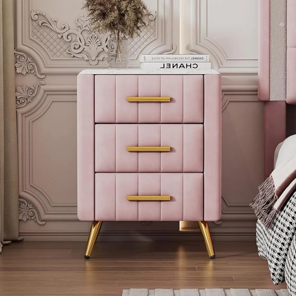 - 【Versatile Velvet Nightstandã€? The modern nightstand with velvet upholstery is perfect for the current bedroom. it has 3 tiers of drawers for plenty of storage space. The classic shape with golden support legs will never go out of style.