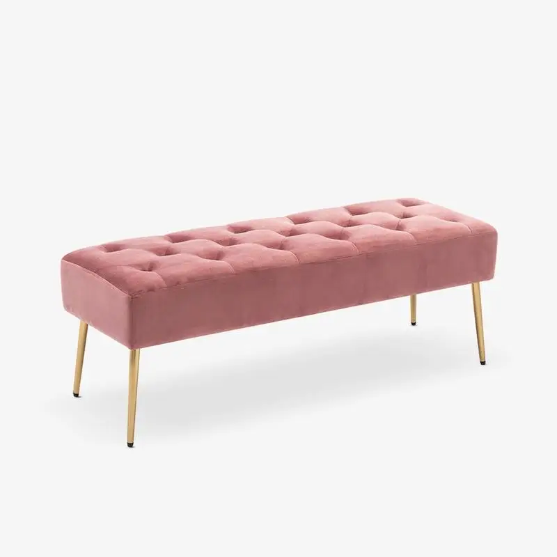 This velvet tufted bench brings a touch of elegance to any space. The soft velvet upholstery paired with the sophisticated tufted design adds both comfort and style. Supported by sleek gold-toned legs. this bench is perfect for entryways. bedrooms. or extra seating in the living room. Its versatile design blends effortlessly with modern and classic decor styles.